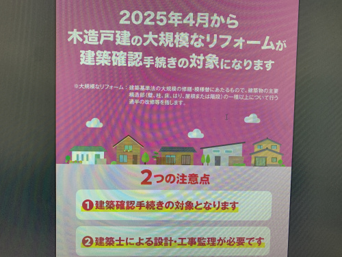 2025年4月から大規模なリフォームもしくは大規模の修繕、壁・柱・梁・屋根などの主要構造部の一種以上について行う過半のリフォーム工事では建築確認申請が必要になります。 ただし、水回りの取り換えや床・クロスの張り替えなど、構造に影響しない場合は、不要です。 また、木造平屋は床面積が200㎡以下であれば、審査が省略されます。はなこ